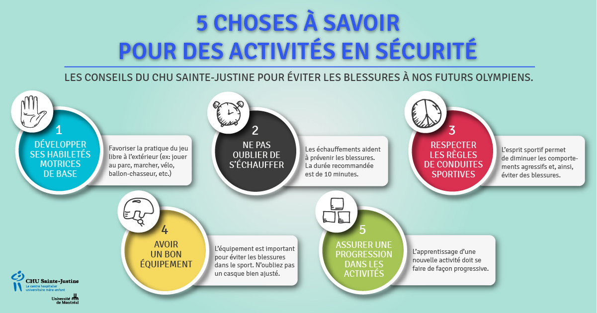Les sports d’équipe, individuels et aquatiques de même que les activités physiques récréatives sont des occasions de développer l’ensemble de ces capacités et ainsi diminuer le risque de blessures.